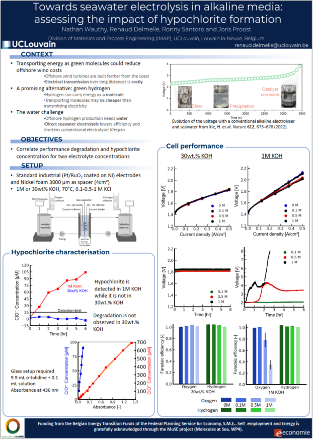 Towards seawater electrolysis in alkaline media: assessing the impact of hypochlorite, N. Wauthy et al. 5th International Conference on Water Electrolysis (ICE), Freiburg, Abstract #135 (2025)